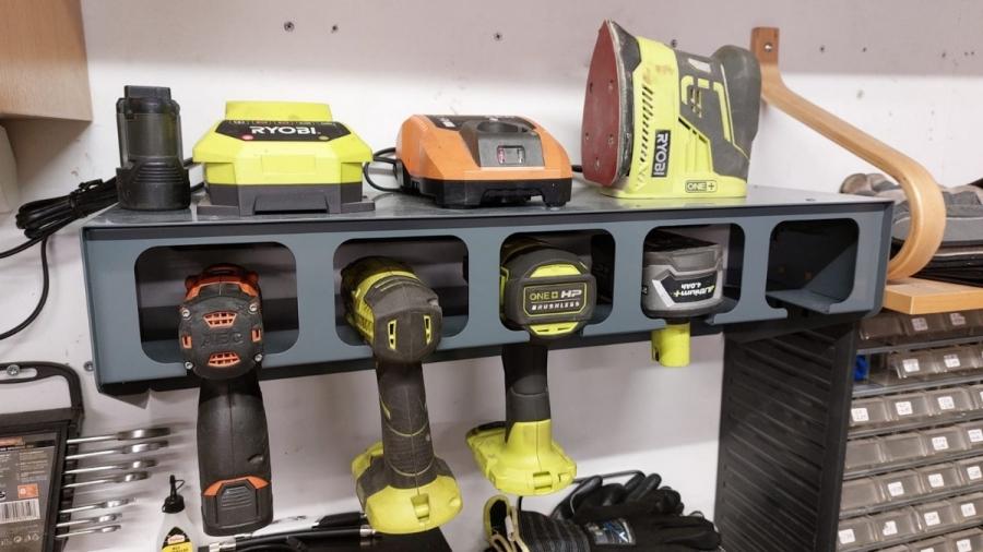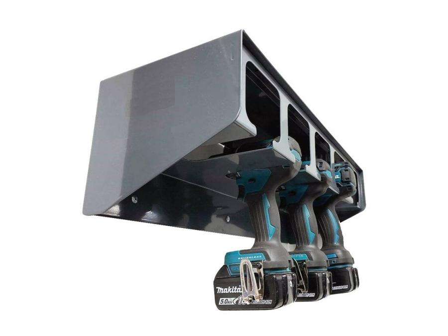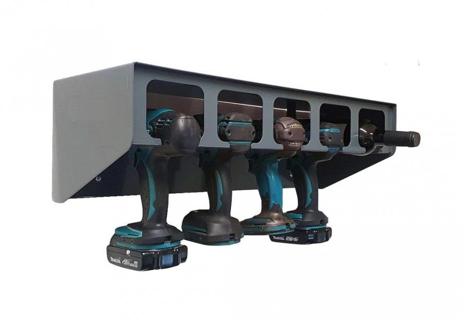 Egy robusztus fali tartó 5 elektromos behajtó, vagy például pneumatikus szerszám számára. A tartó felső része tökéletesen funkcionál akkumulátortöltő platformként is. Ellenálló fémből készült, tartós porfesték bevonattal.